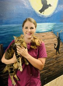 My name is Bethany Parks. I have worked for Sullivan Veterinary Clinic since August 2013. I am a veterinary technician. From a young age, I have had a deep love for animals, so when I was offered the job I was more than happy to accept the offer. I’m from small town Crowville, Louisiana. I have a very chunky Dachshund who was adopted from a shelter, a very spunky Boston terrier mix and a lovable cat who were both rescued as babies. One of my jobs around the clinic is to help place animals who are available for adoption to forever homes.